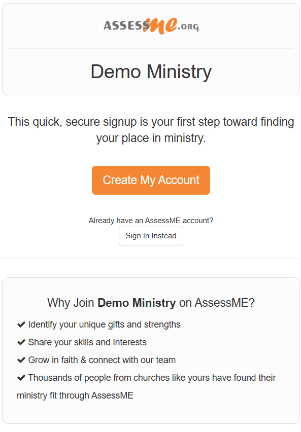 Simply paste-in the email addresses of the people you wish to assess into our mass email program…and hopefully this is everybody in your church…and then they will receive a preformatted email invite, labeled with your ministry name (See Below). Each person proceeds to create their own user accounts and from there to complete their personal assessments. It is truly that easy! In fact, a mega-church can have the majority of their congregation assessed within only a few weeks. Our largest clients have assessed over 10,000 people! Consequently, inviting people is the only “work” you have when using AssessME.org. We designed our platform to free you to work with people, not software. View our sample “Demo Ministry” email invite below…